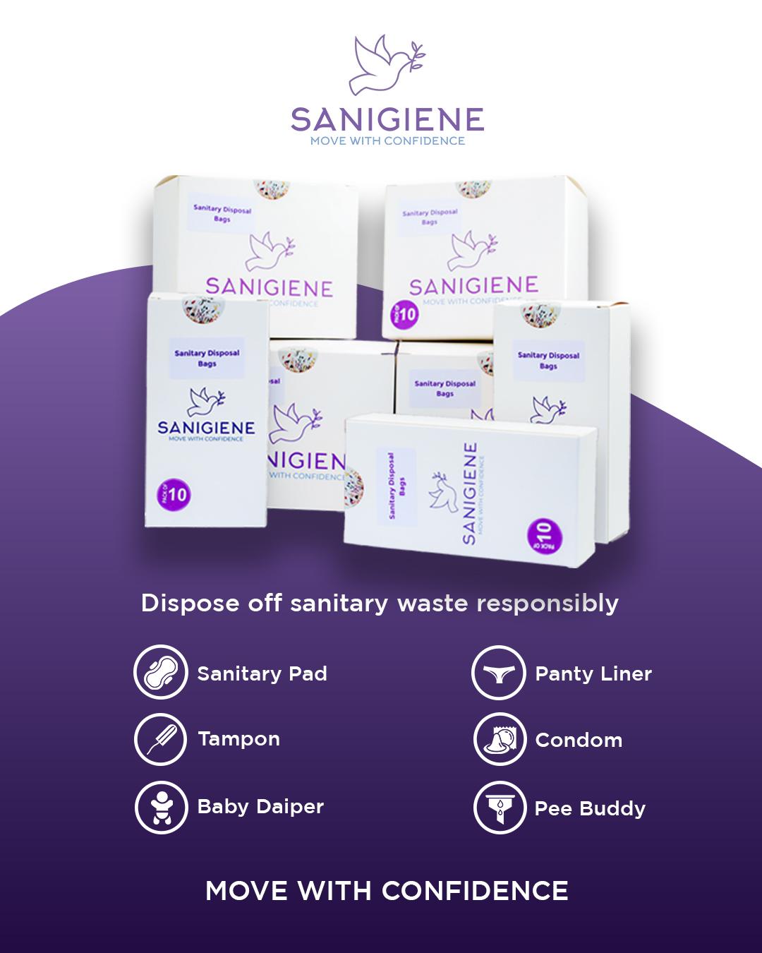 Sanigiene Sanitary Disposal Bags are a must-have solution designed for discreet and hygienic disposal of sanitary products as well as other products that need discreet disposal. These durable, leak-proof, and multi-use bags are designed to seal in odours and provide a secure, discreet and hygienic way to dispose of sanitary pads, tampons, condoms, panty liners, pee buddies and other items. Compact and easy to carry, they ensure you can confidently dispose- off products wherever you are, whether at home, at work, or on-the-go. With Sanigiene, you can enhance your hygiene routine, maintain cleanliness, and move with confidence, knowing that you are always prepared for your personal care needs. Sizes: 13*19+5*2+2CM